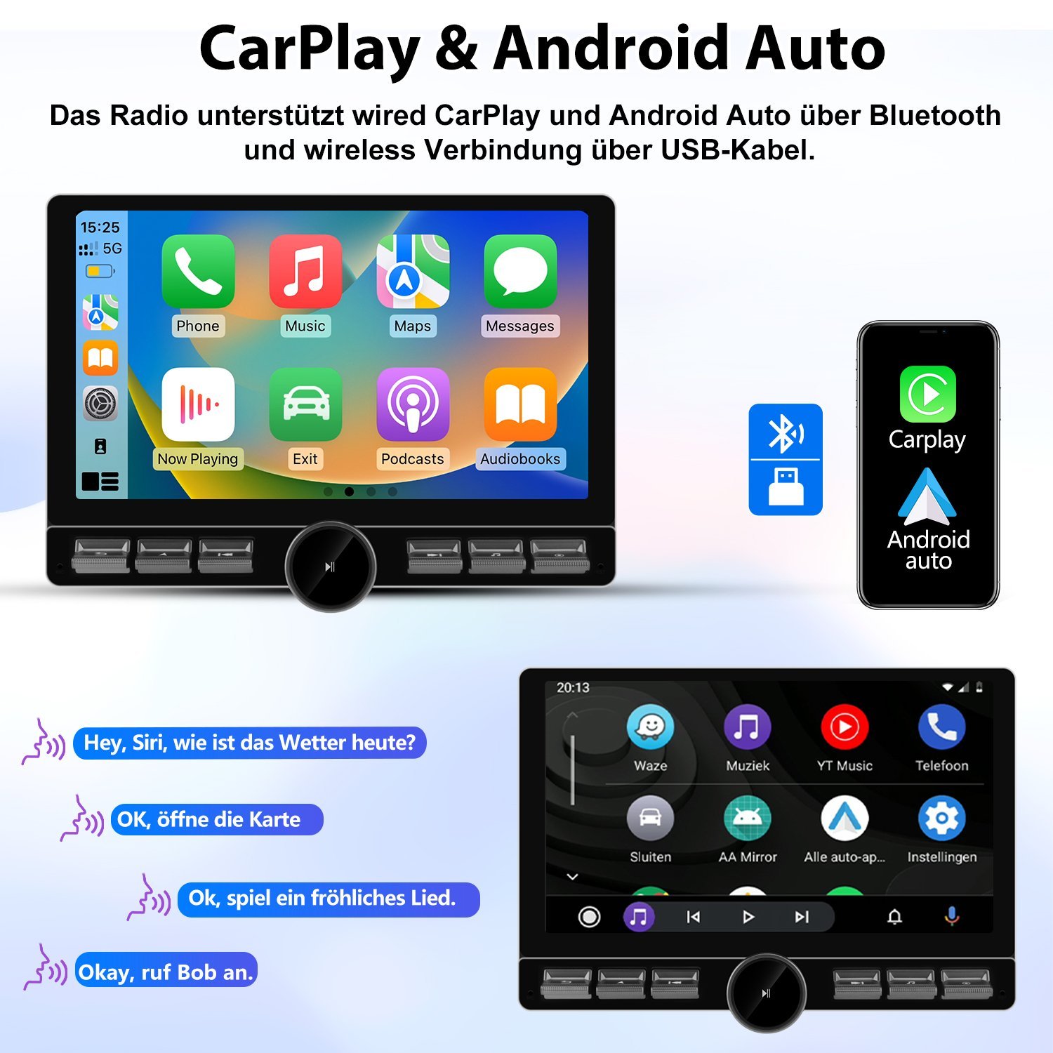 Spiegeln Sie Apps wie Navigation, Musik oder Nachrichten direkt vom Smartphone auf den Bildschirm. Die Sprachsteuerung ermöglicht eine sichere Bedienung während der Fahrt – ohne Ablenkung.